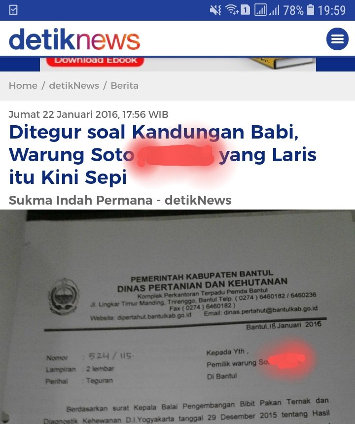Beberapa hari kemudian, saat saya sedang duduk-duduk di depan kontrakan, pusing dengan tesis yang tak kunjung selesai, Chenunk tiba-tiba mengirim wa. Beserta sebuah link berita, tentang warung Soto tempat kami makan.